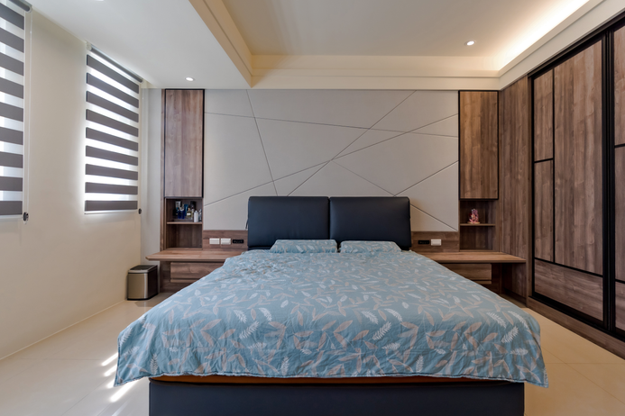 藉由特殊牆面處理使空間增加層次弧形收編的柱體添加燈條使牆面添加注目效果搭配灰色系沙發呼應牆面設計加上木質材質作為整體家具搭配更衣室採用全白的櫃體設計化妝桌台則選用白色大理石花紋設計_